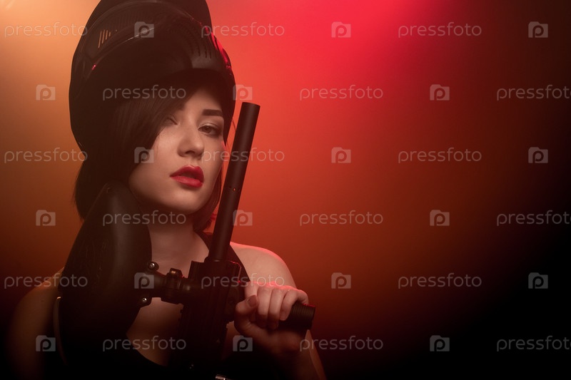 Девушка позирует с ружьем для пейнтбола