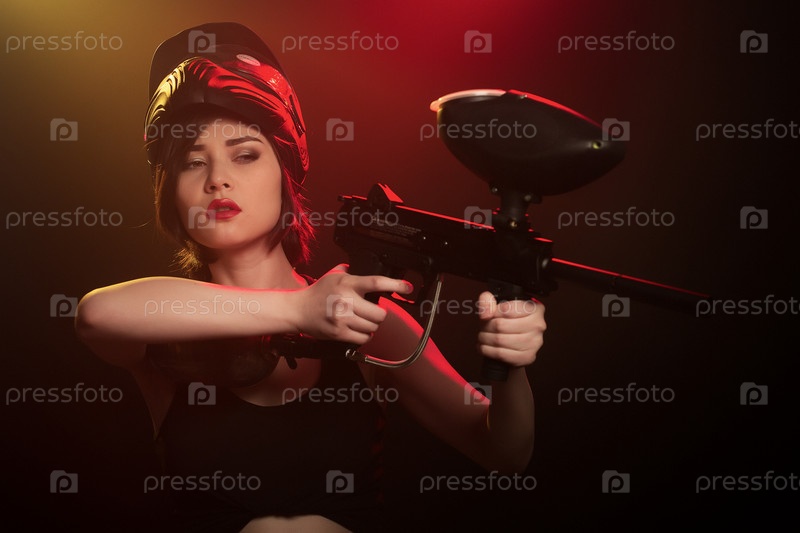 Девушка позирует с ружьем для пейнтбола