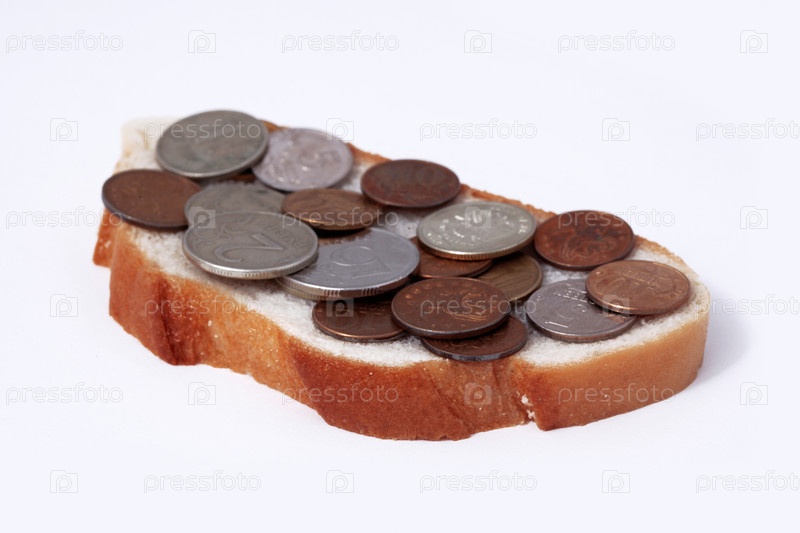 Кусок хлеба с денежными монетами на белом фоне