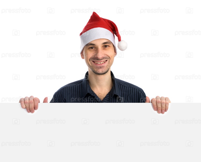 Счастливый мужчина в шляпе Санты с пустым знаком