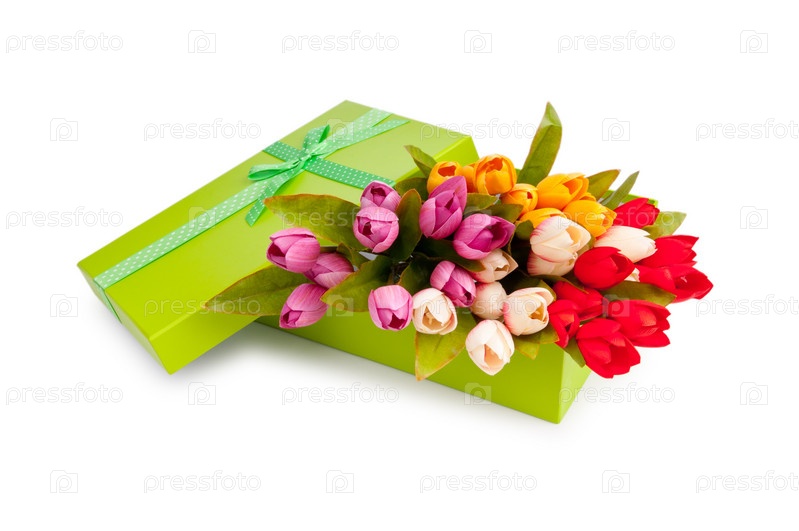 Подарочная коробка с тюльпанами, изолирована на белом