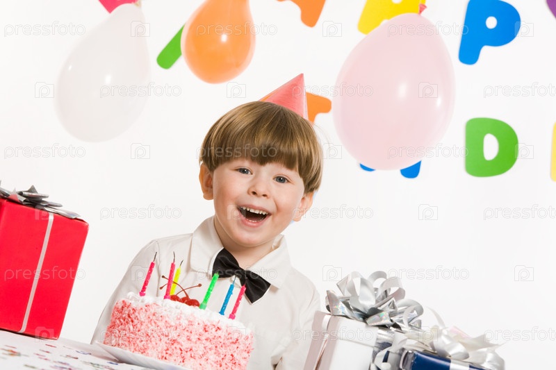 Портрет счастливого мальчика, смотрящего в камеру и смеющегося на день рождения