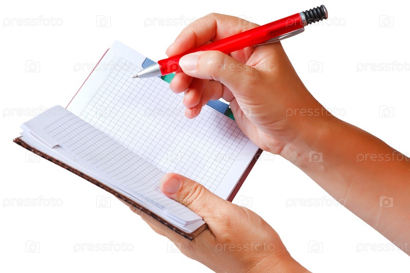 Руки с ручкой и блокнотом на белом фоне