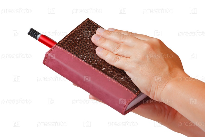 Руки с ручкой и записной книжкой на белом фоне