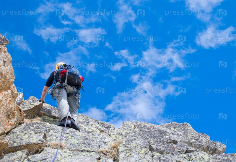 Скалолаз со снаряжением в горах