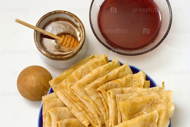 Тарелка с блинами, мед и варенье