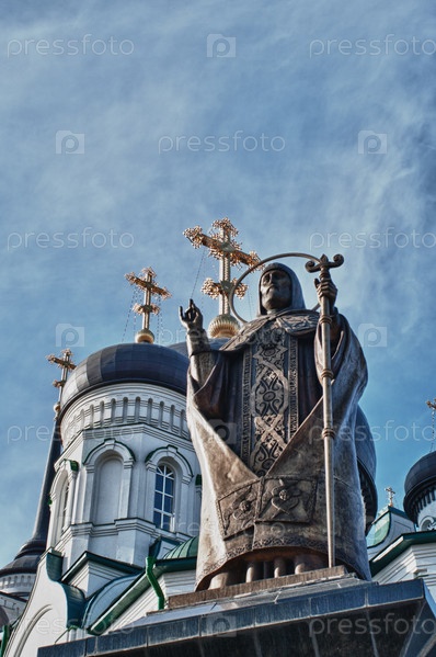 Статуя святого Митрофана на фоне церкви
