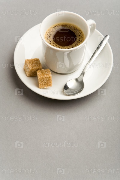Изображение фарфоровой чашки с сильным черным кофе и двумя кусками сахара на тарелке
