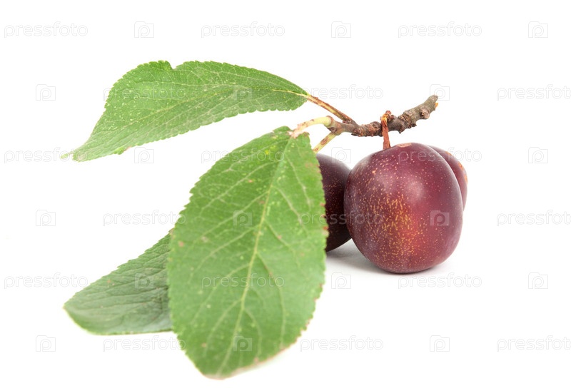 Веточка с тремя листочками и тремя сливами. Изолированные на белом фоне