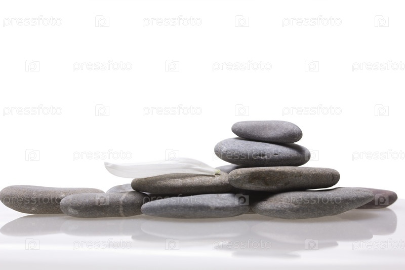 Морские камни и белый лепесток лежат в воде на белом фоне