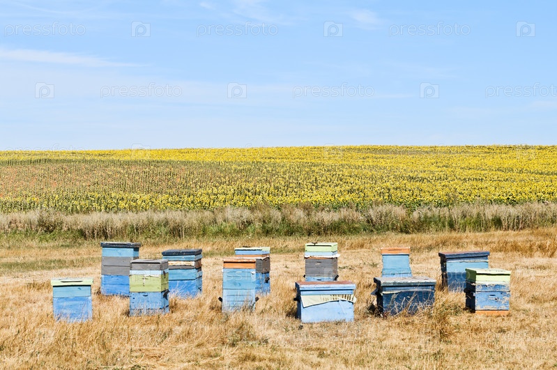 Пасека. Улья и поле подсолнечника