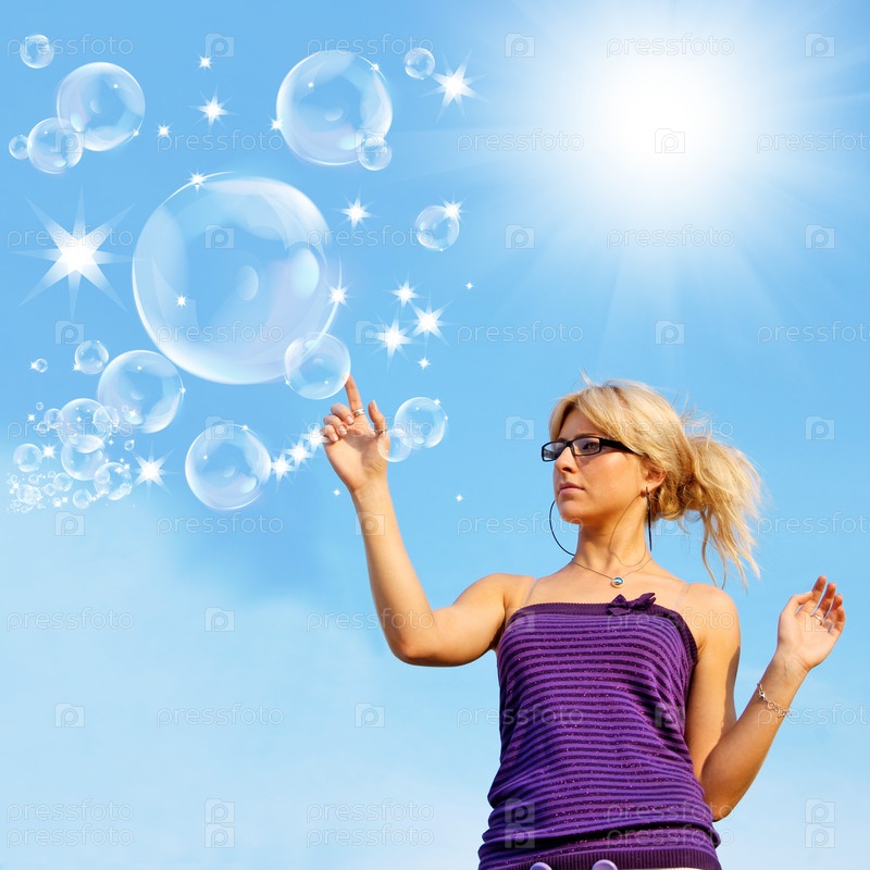 Девушка и мыльные пузыри на фоне яркого солнца