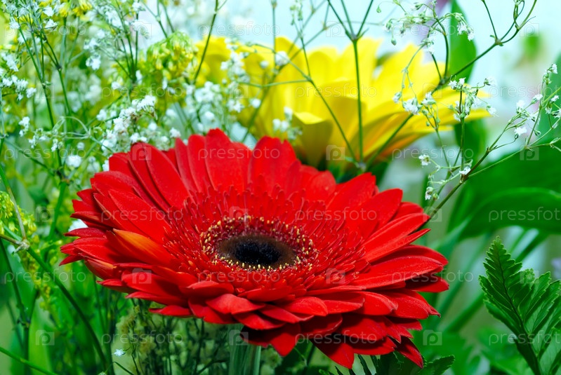 Красная и желтая герберы в зелени