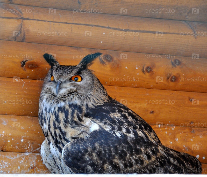 Филин на фоне деревянной стены