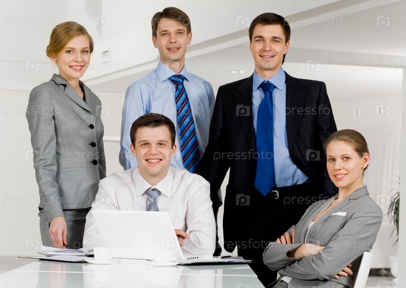 Портрет нескольких уверенных в себе коллег, смотрящих на камеру с улыбкой на рабочем месте