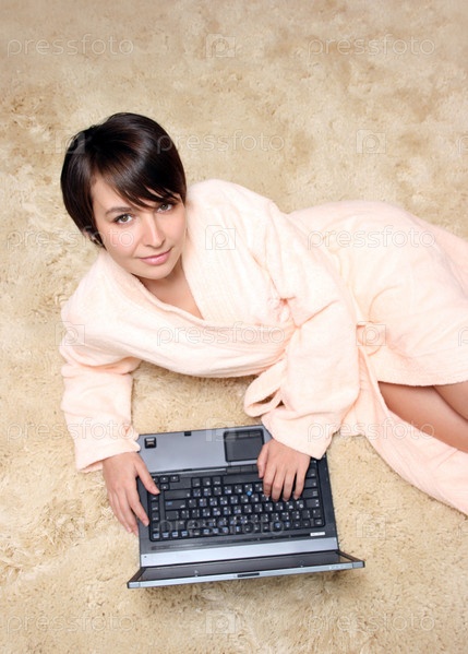 Счастливая женщина, лежащая на ковре с ноутбуком
