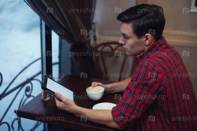 Молодой мужчина в клетчатой рубашке в кафе читает планшет