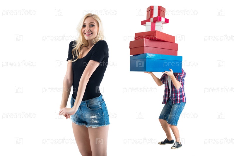 Симпатичная блонлинка в черной футболке ждет сюрприз