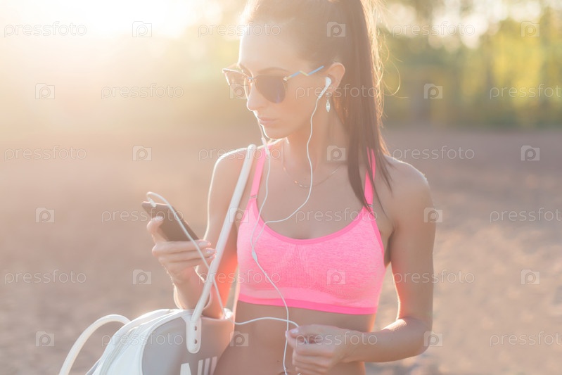 Спортсмен прослушивания музыки женщины глядя на смартфон после тренировки в природе на открытом воздухе портрет летний вечер на пляж праздники и каникулы здорового образа жизни
