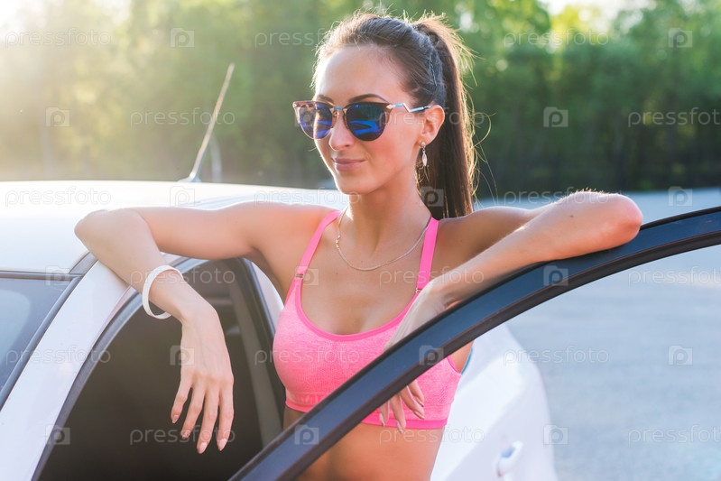 Спортсмен спортивный подходит молодая женщина в спортивный лифчик носить солнцезащитные очки стоя, опираясь на машине с дверью, открытой, глядя на камеру