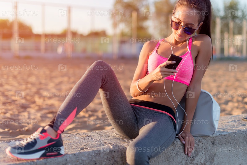Спортсмен женщина красивая Фитнес носить солнцезащитные очки, прослушивания музыки для отдыха после работы, занятий на летний вечер в пляж на закате с смартфон открытый портрет
