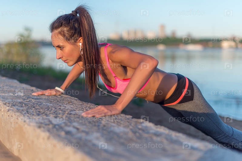 Женщина фитнес, делая нажима ИБП открытый учебные тренировки летом вечером сбоку концепции спорта здорового образа жизни
