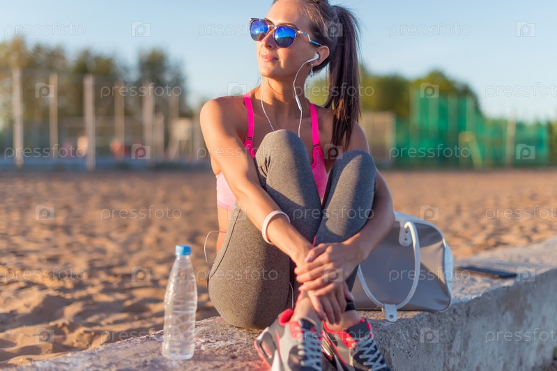 Спортсмен женщина красивая Фитнес носить солнцезащитные очки, слушая музыку, отдыхая после работы, занятий по летним вечером в пляж на закате открытый портрет