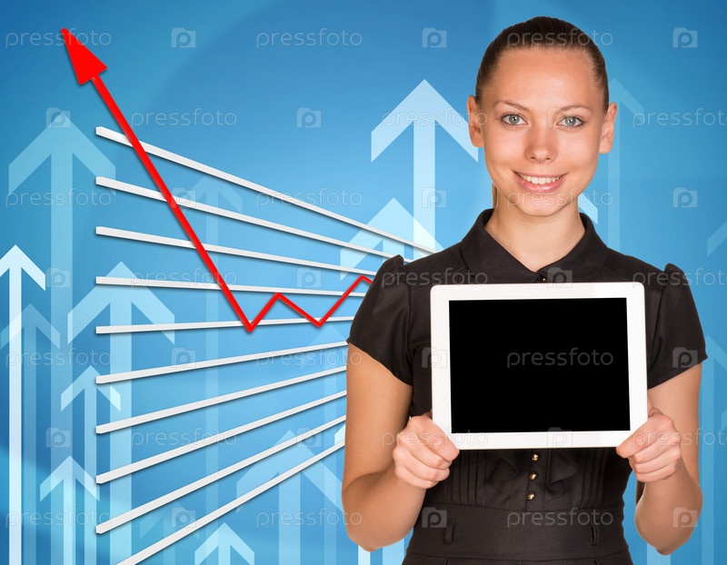 Молодая женщина держит планшет