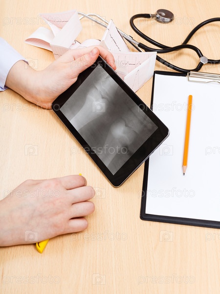 Врач исследует рентгеновский снимок коленного сустава