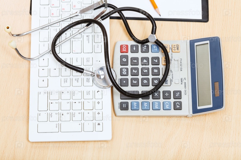 Стетоскоп на клавиатуре, калькулятор и буфера обмена