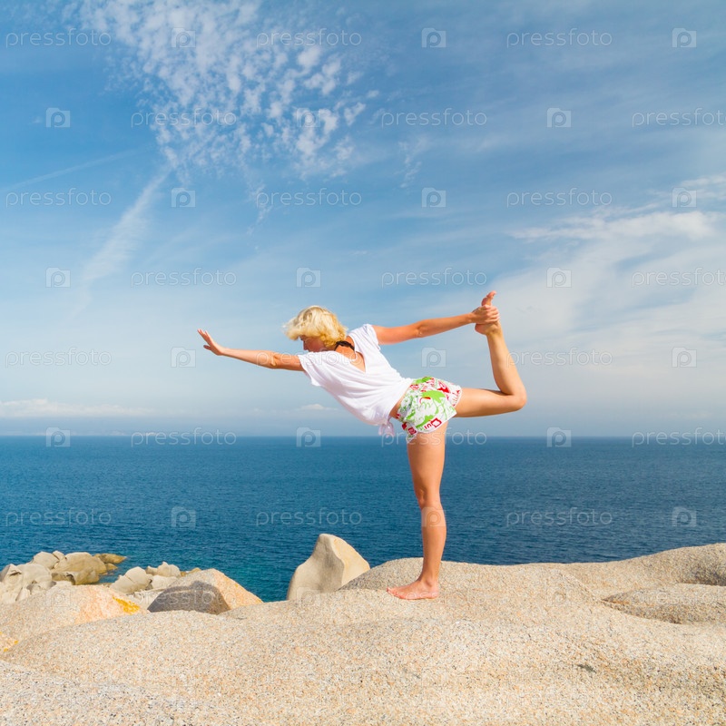 Девушка в позе из йоги на берегу моря