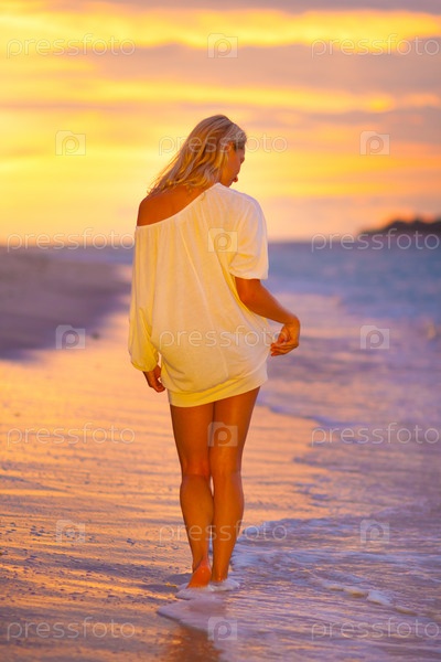 Девушка гуляет по кромке моря на закате
