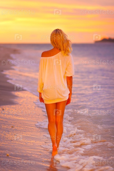 Девушка гуляет по кромке моря на закате