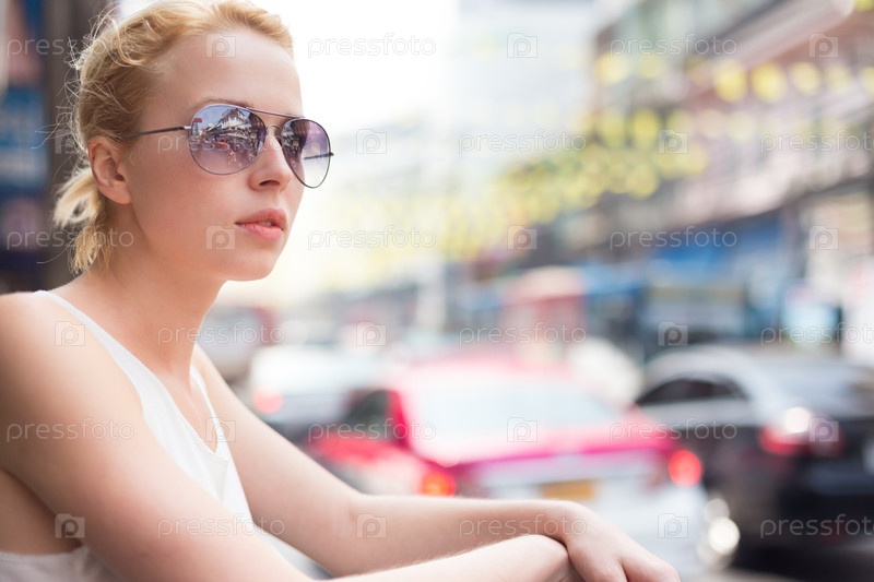 Девушка в солнечных очках на фоне города