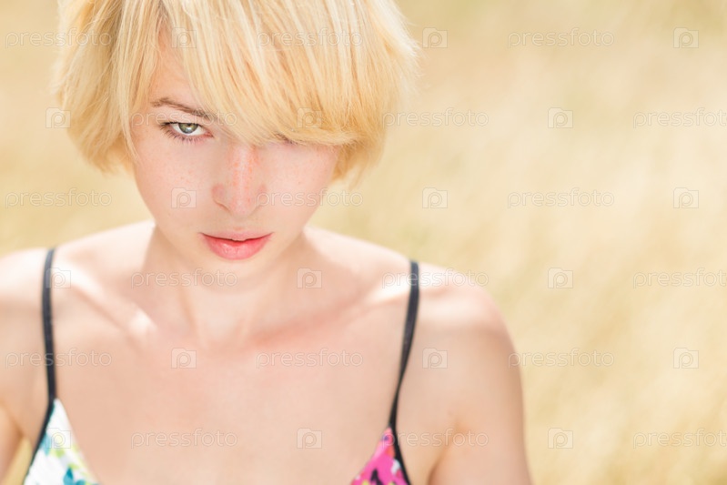 Девушка-блондинка в поле в цветочном платье
