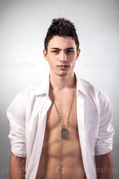 Здорой мускулистый молодой мужчина на сером фоне в белой рубашке