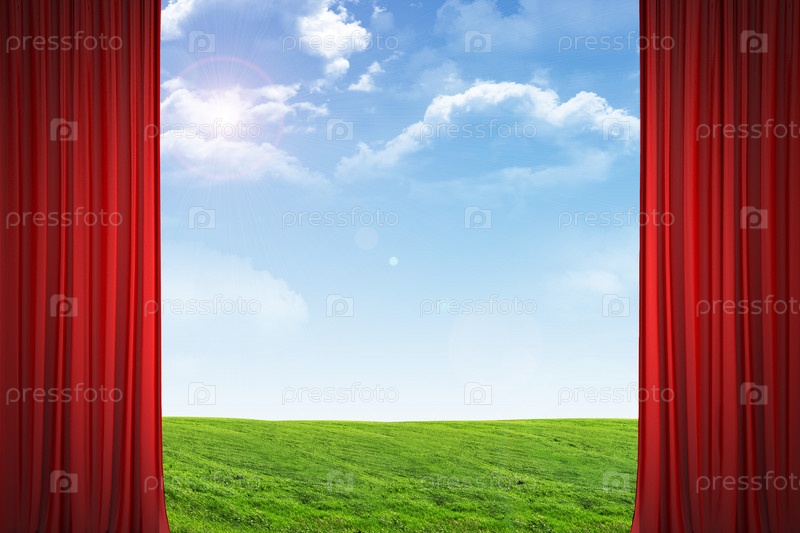Шторы и пейзаж под голубым небом
