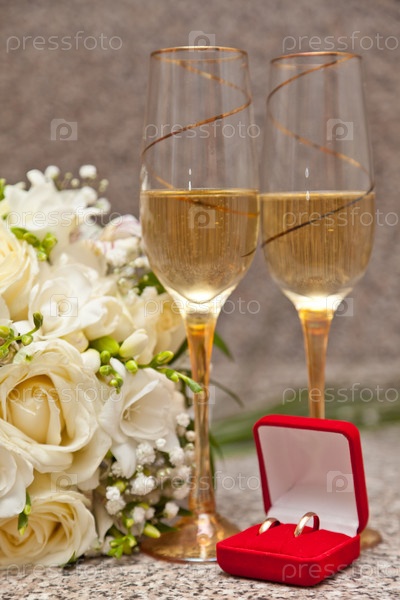 Свадебный натюрморт с кольцами, букетом и шампанским