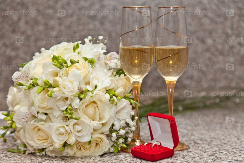 Свадебный натюрморт с кольцами, букетом и шампанским
