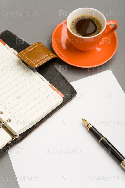 Изображение пустого листа бумаги с ручкой и красной чашей кофе рядом