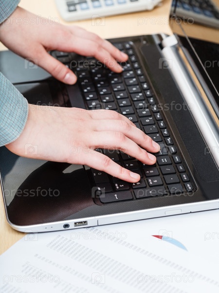 Бизнесмен, работает с ноутбуком на офисном столе