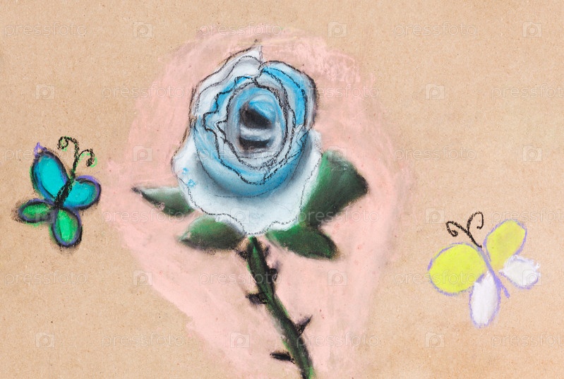Детский рисунок - голубая роза и две бабочки