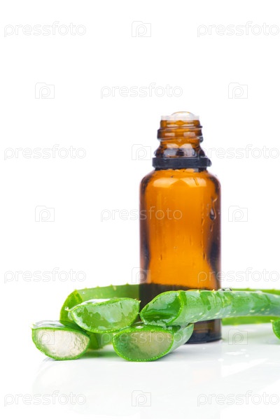 Лист алоэ и флакон с экстрактом на белом фоне