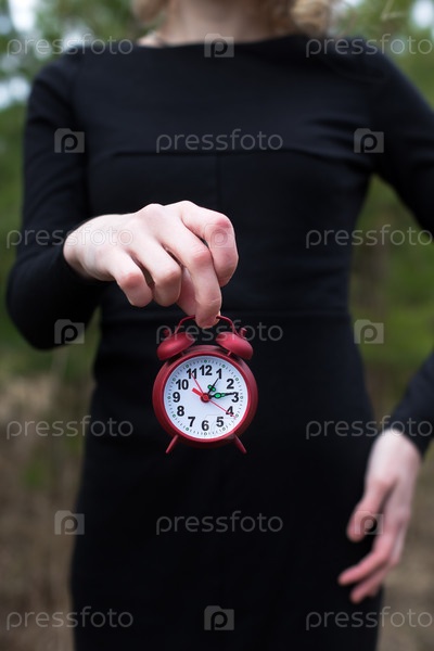Женщина в черном платье с красным будильником