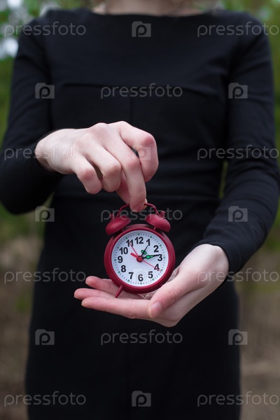 Женщина в черном платье с красным будильником