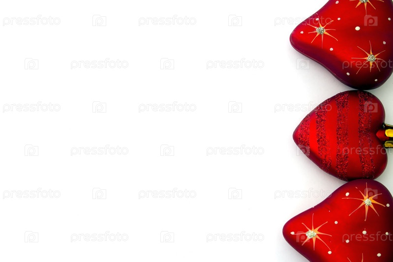 Елочные игрушки в форме сердца на белом фоне