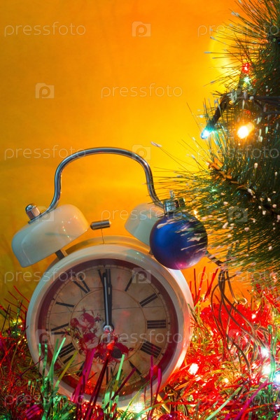 Рождественская елка с гирляндами и будильник 12.00