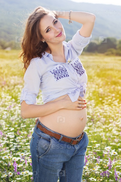 Счастливая беременная женщина на ромашковом поле