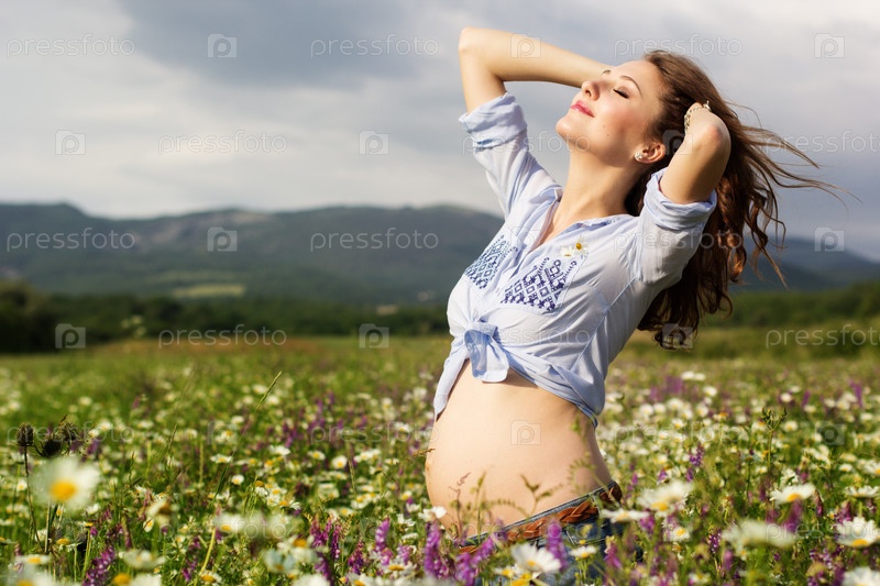 Счастливая беременная женщина на ромашковом поле