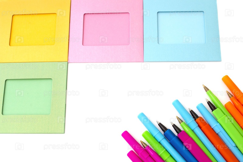 Фоторамки и цветные ручки на белом фоне
